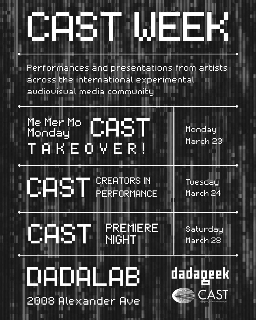 Throughout CAST week, audiences will experience performances and presentations by artists across the experimental sound and visual media community, culminating in the final night.