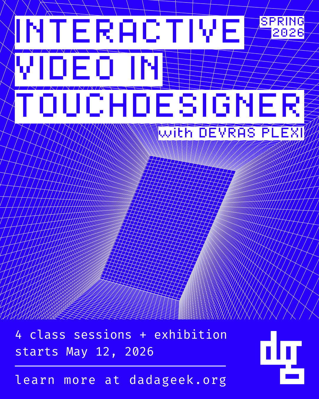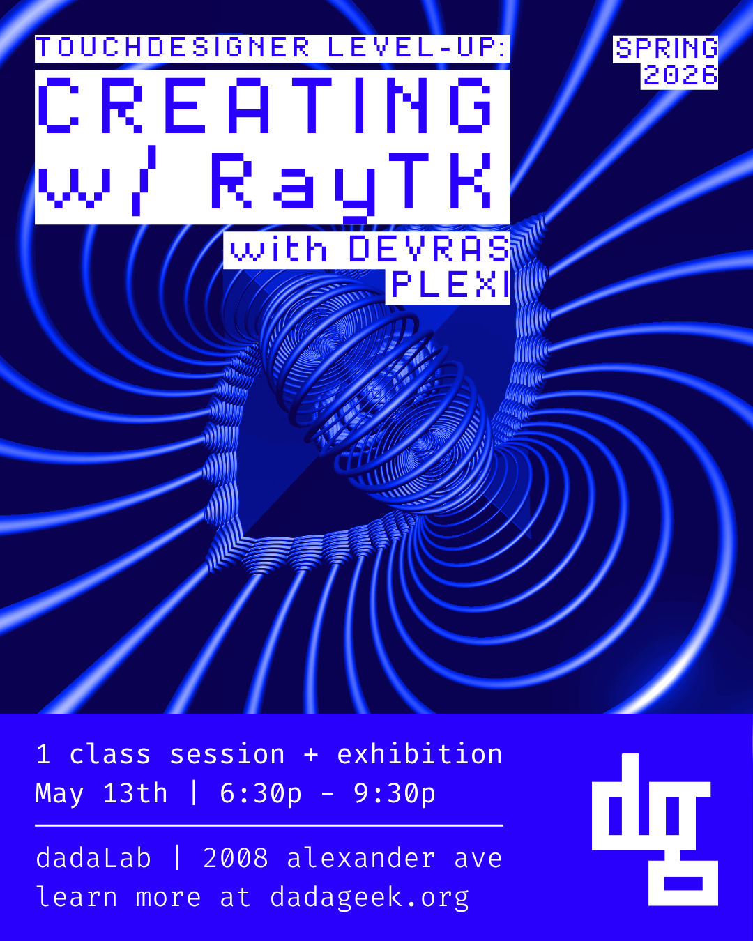 This course will walk you through everything you need to know from start to finish. So whether you're completely new to the world of visuals, or looking to level up your VJ skills; you'll learn a lot from this class. Your instructor will be available to help all along the way, to answer specific questions, & help solve your unique problems; the video lectures won't be your only resource. At the end of the quarter, students will have the opportunity to participate in the dadageek exhibition where they can show off their sculptures & visuals.